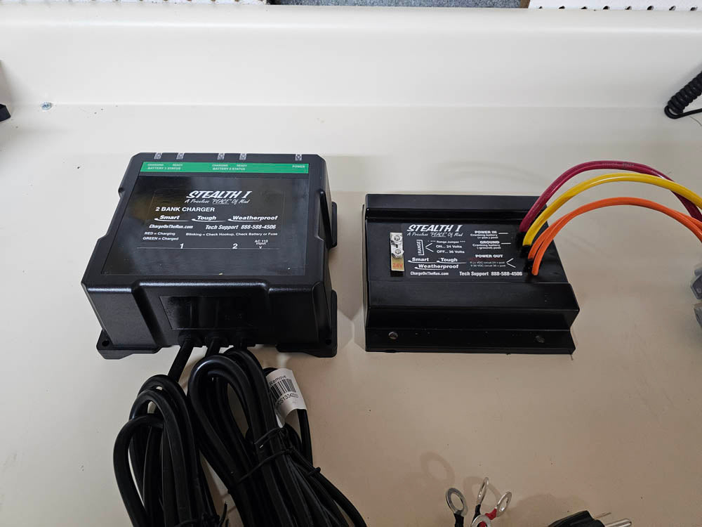 *Stealth I Max Pack Pro – Includes the Stealth I DC, the Stealth I 12 Amp AC, and the Stealth I Gauge. Part Number – 01-A20-D40-G1224 or G36 ………. (Package stacked 4.5” thick) *Stealth I Gauge 9-44 volts. Part Number 01-G24/26 The Stealth I voltmeter was designed to be the most versatile instrument in the electrical circuit. With a low/high voltage alarm for protection, know when you need to run or plug-in and alarmed for over & under charging protection. Know for sure your electrical condition exactly at all times. And you can test Stealth and all the batteries any time in your regular maintenance and we will help you. Yes with this meter installed in the console area you can read and test your whole electrical circuit with a ½ inch digital read out. *Stealth I Pro – Includes the Stealth I DC and the Stealth I 12 Amp AC. (Package stacked 4” thick) Part Number – 01-A20-D40 *Stealth I DC – Includes the Stealth I DC. Part Number – 01-D40 DC package – Includes the Stealth I DC, and the Stealth I Gauge. *Stealth I AC 12 Amp - Includes the Stealth I AC 12 Amp. 6/6 2 output or 12 single TOW Package Includes the DC, Gauge and Tow Harness TOW Harness Fits vehicle and boat for charging while you tow. (40 amps if needed) Stealth Max Extreme Includes the DC, AC, Gauge and Tow Harness Emergency Kit Safe & easy cranking using the crank & trolling battery for emergency cranking “JUST TURN IT ON AND CRANK” GET IT ALL !!! “Extreme Plus”